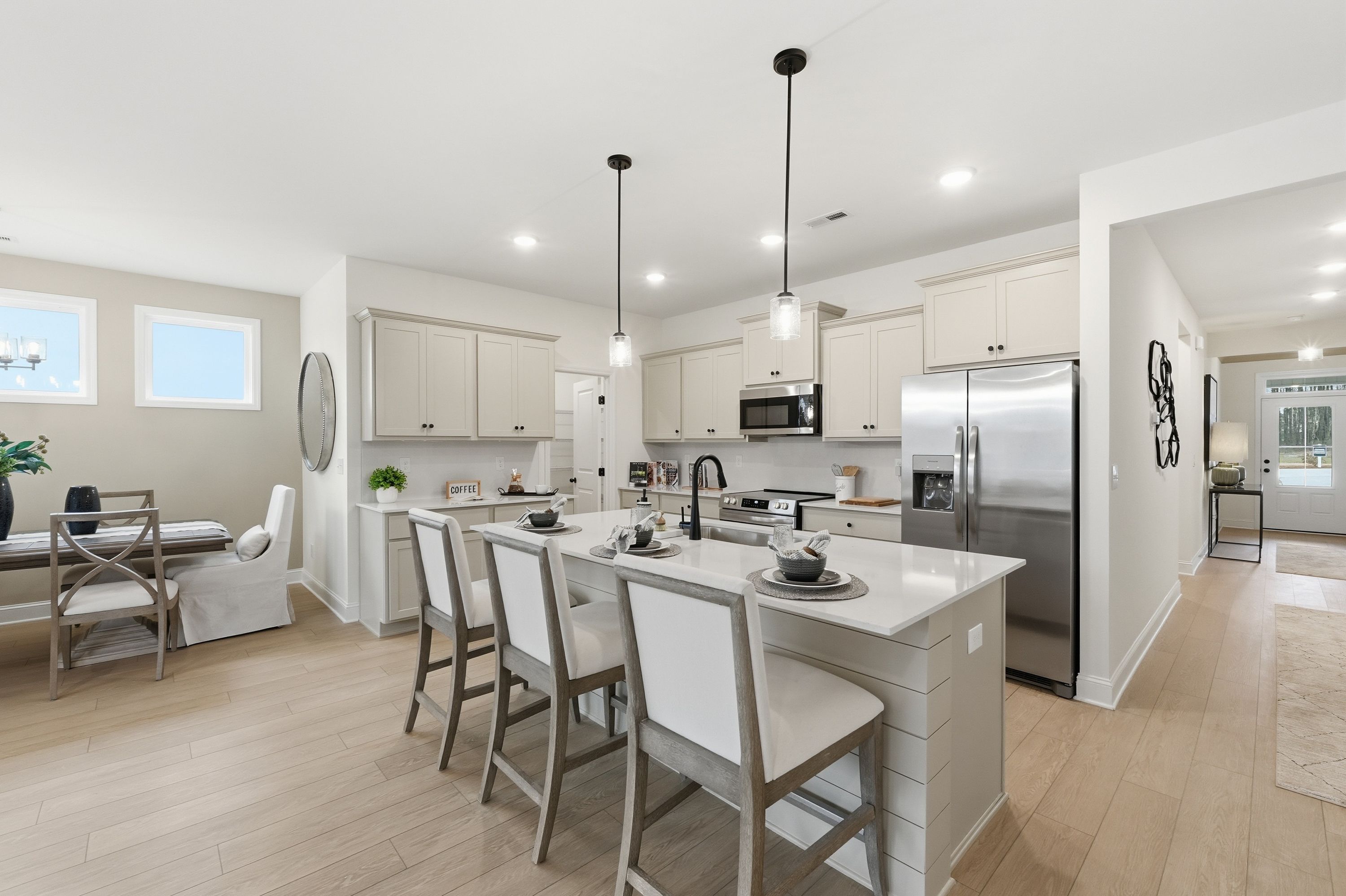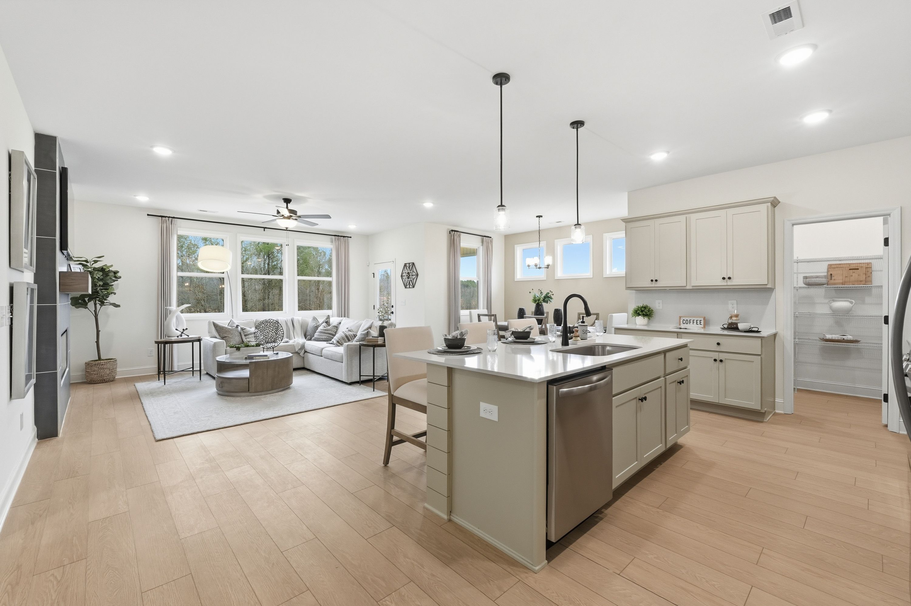 With its welcoming Hardie Board exterior and bright, open layout, The Laurel makes it easy to showcase your style. Sunlight fills the open-concept family room, creating an inviting space for entertaining or relaxing. The kitchen flows seamlessly into the living area and includes a charming breakfast nook and a spacious walk-in pantry, giving you both convenience and character.