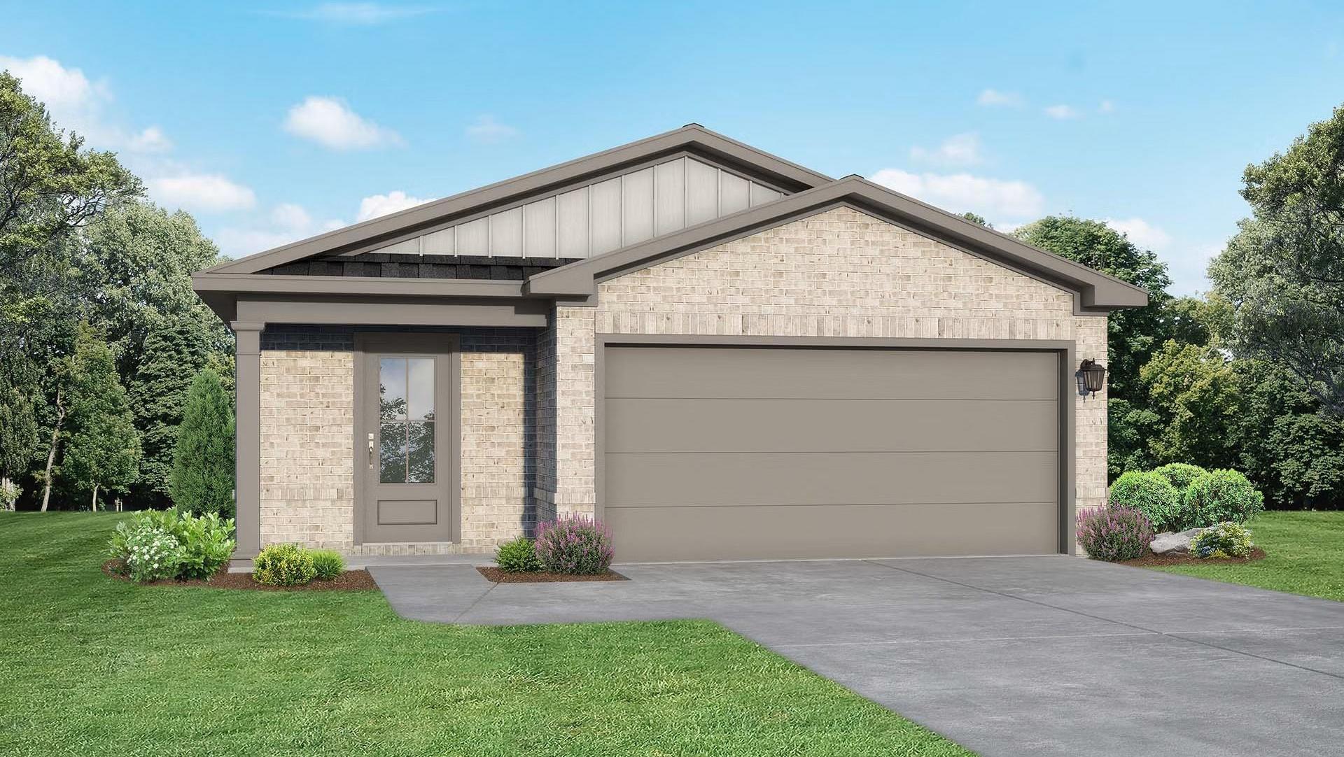 Modern 1-story brick and siding home with 2-car garage, driveway, and landscaped yard in Liberty Estates, Cleveland, Texas - Davidson Homes Frio G