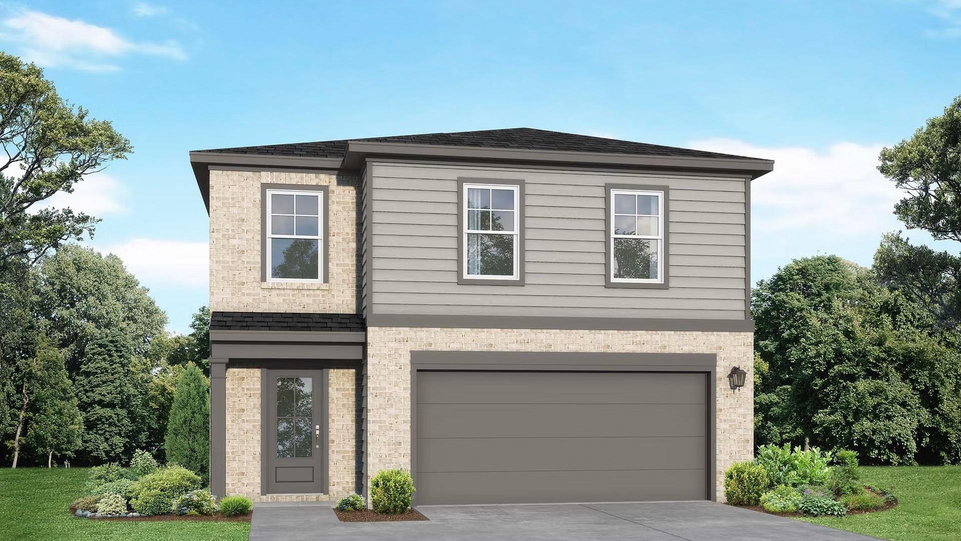 Two-story Sabine F home with brick and siding exterior, 2-car garage, driveway, and lush landscaping in Liberty Estates, Cleveland, Texas