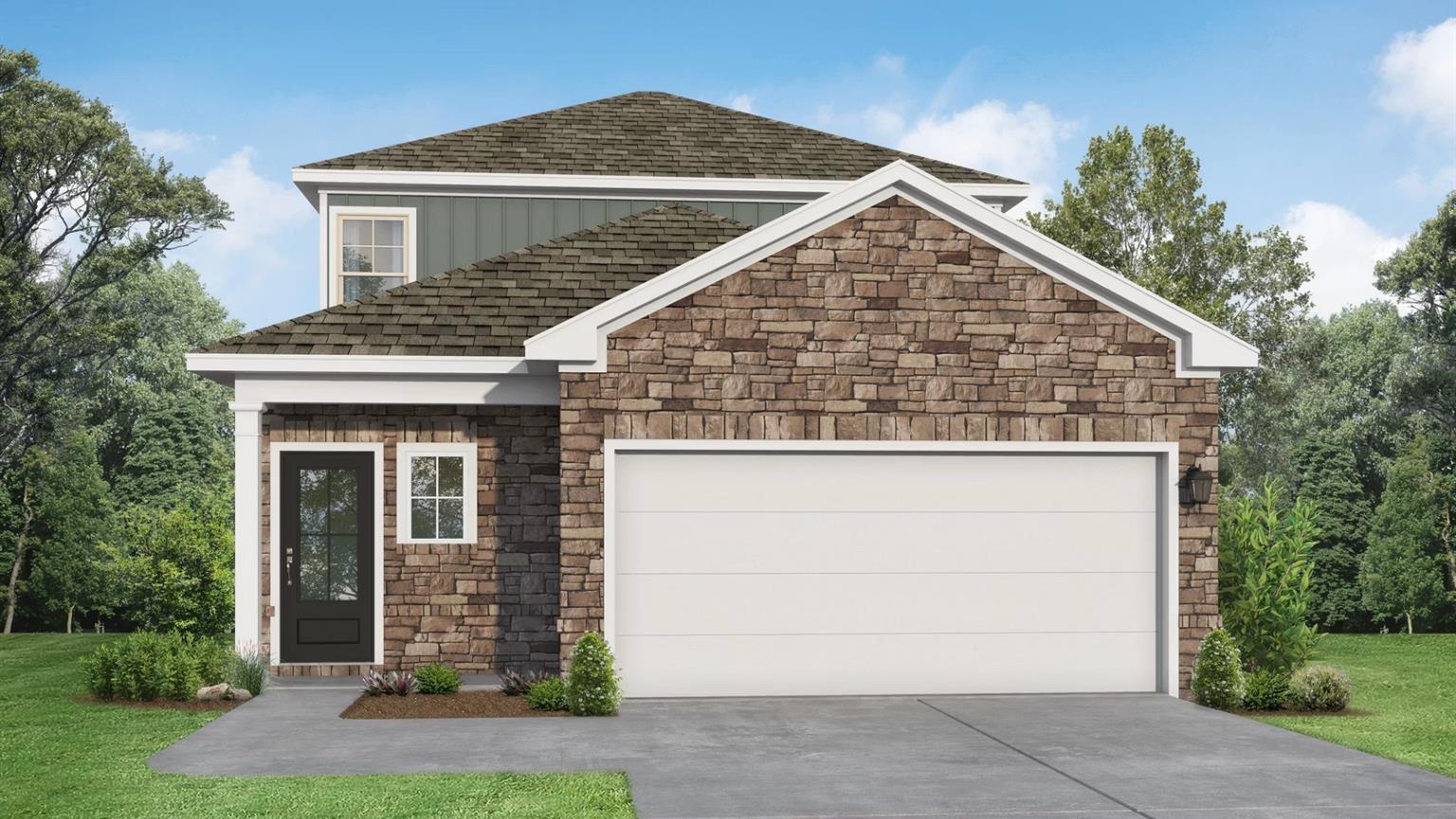 Two-story Sabine E home with stone facade, 2-car garage, and lush front yard landscaping in Liberty Estates, Cleveland, Texas