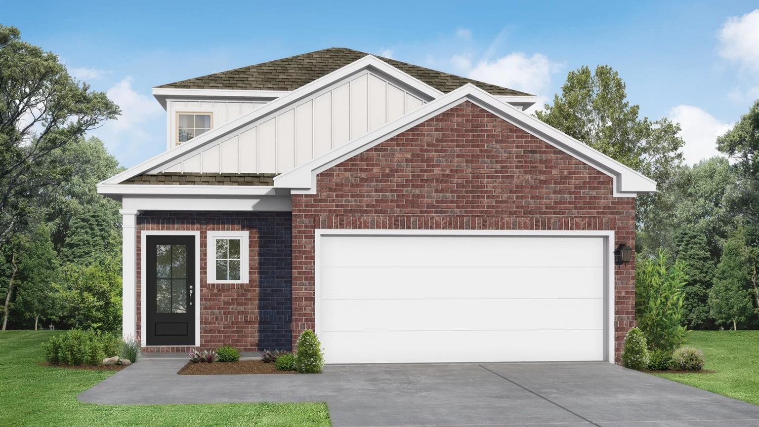 Front exterior of 3-bedroom Davidson Homes The Frio G: brick facade, black door, 2-car garage, covered porch in Cleveland, Texas