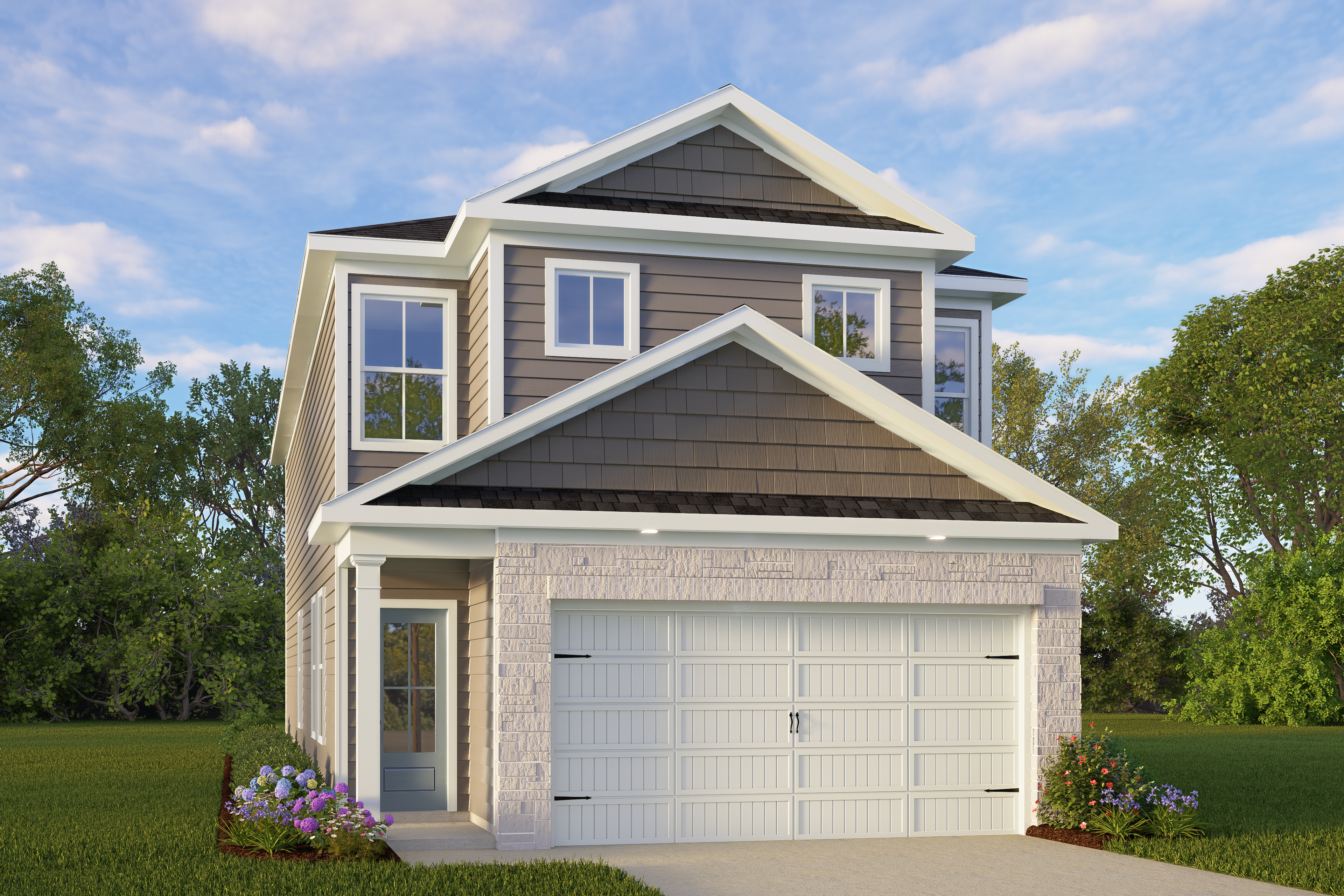 The Charlotte is a two-story, 3-bedroom, 2.5-bath home with a long foyer that leads to an open family room, dining area, and kitchen on the main floor. The kitchen features great counter space and flows seamlessly into the dining and living areas. The attached two-car garage provides easy access to the home.